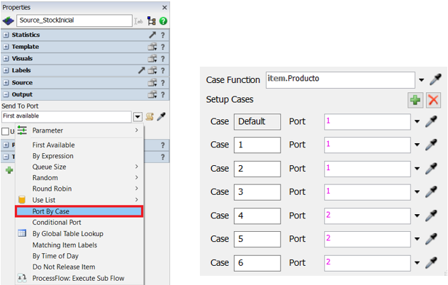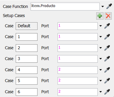 En este menú, seleccionamos en el apartado Send To Port y dentro de él la opción de Port By Case. Se nos abre una pequeña ventana para establecer el criterio, que como se puede intuir de la tabla de llegadas, se hará según la etiqueta Producto. Creamos 6 casos pulsando sobre el icono