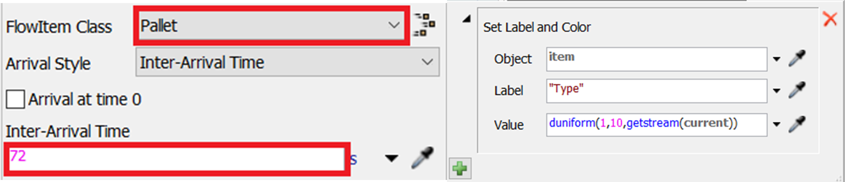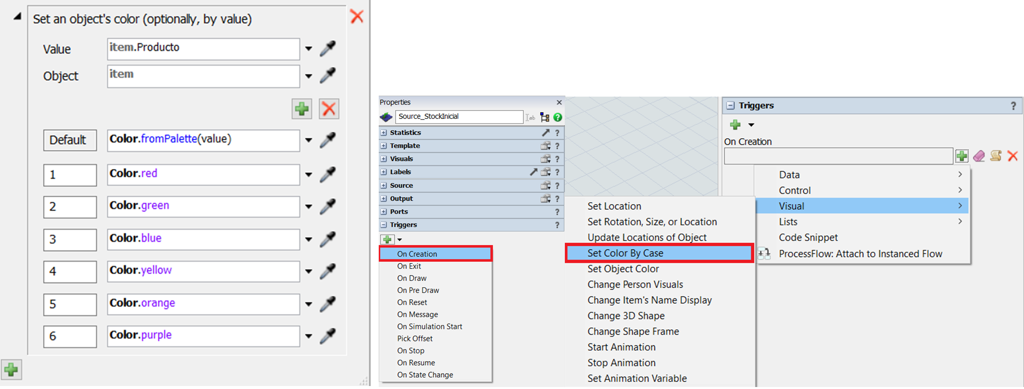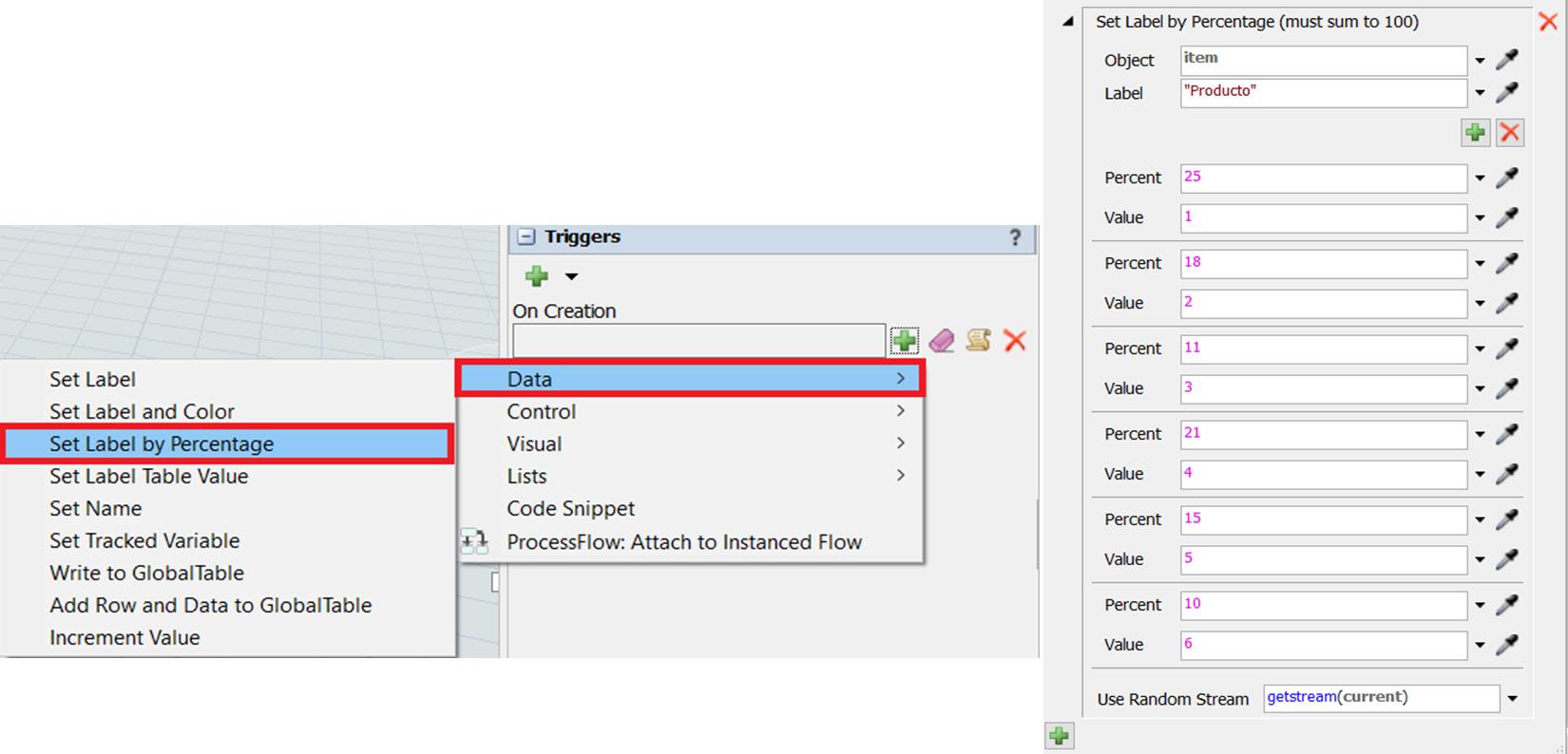 En el apartado de Triggers de esta fuente, creamos un trigger de tipo On Creation → Data → Set Label and Color. Con este trigger crearemos la etiqueta Type, que se elige por defecto, y cambiaremos el color de los Pallets según ésta a un color aleatorio según una distribución uniforme entre 1 y 10.