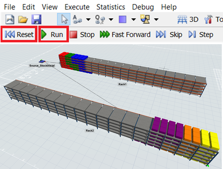 Con este último paso, ya tenemos el comportamiento de la Source completamente definido. Para verificar que es el esperado, pulsamos sobre Reset y Run del menú superior y observamos las cajas creadas en los Racks.
