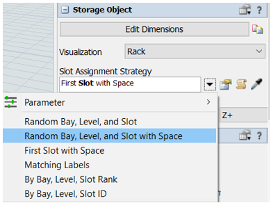 Para obtener una distribución más aleatoria de las cajas en los Racks, abrimos su menú de Properties y, en el apartado Storage Object, seleccionamos Random Bay, Level and Slot with Space para la Slot Assignment Strategy.