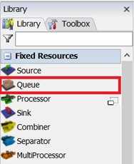 Continuando con la construcción del modelo, arrastramos un objeto Queue del menú Library en el apartado de Fixed Resources. Una vez en la vista 3D podemos ajustar sus dimensiones y tamaño.