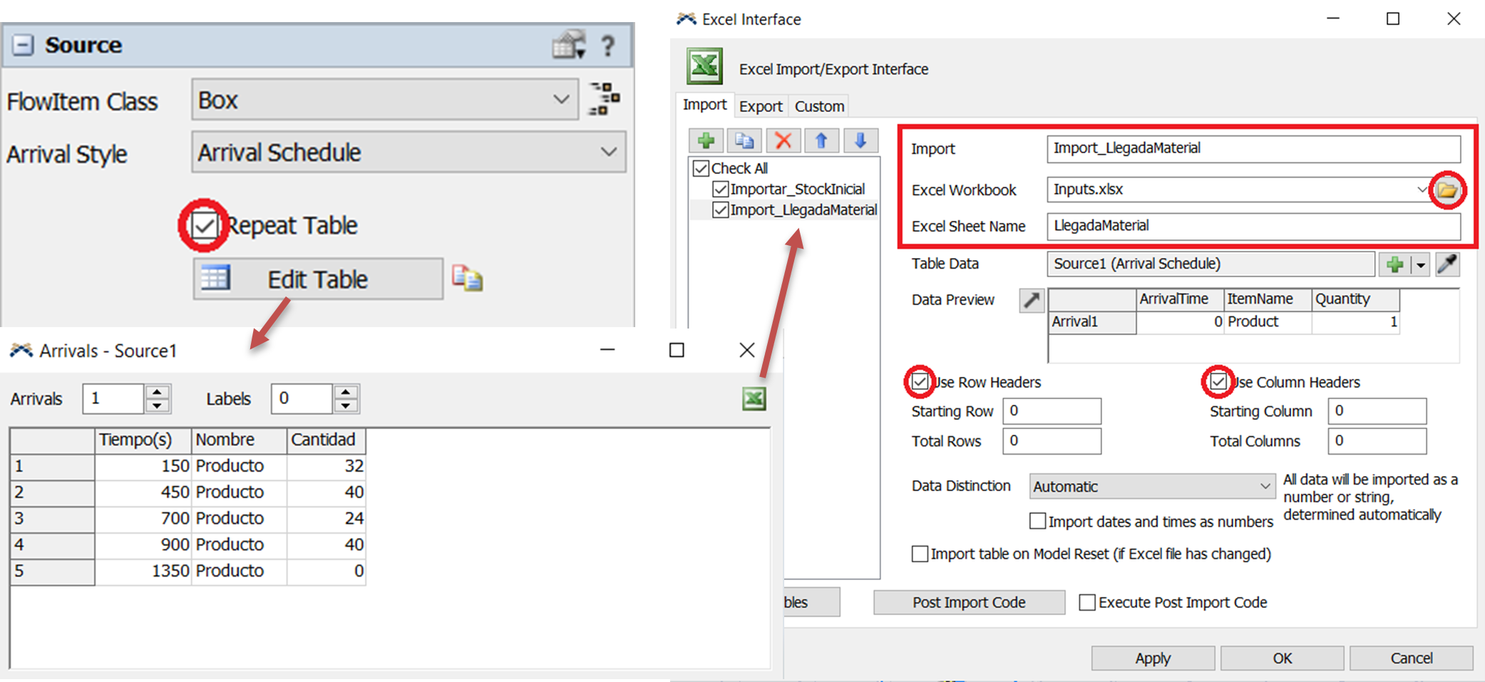 Para alimentar esta cola, creamos una segunda Source, para la que vincularemos las llegadas con el mismo archivo Excel que la fuente de stock inicial, pero en una hoja diferente, que contiene estas llegadas. Este proceso es idéntico al de la primera Source, con la única diferencia que en este caso vamos a querer que la tabla se repita cíclicamente, marcando Repeat Table en el menú Properties.
