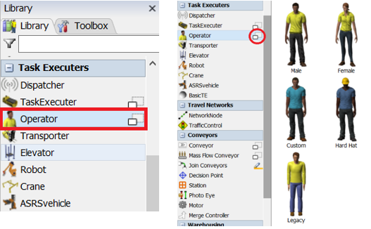 Estas salidas no se harán de manera automática, sino que serán realizadas por unos operarios. Procedemos, entonces, a colocar cuatro operarios en el modelo. Podemos arrastrar objetos del tipo Operator del menú Library en el apartado de Task Executers o, pulsando sobre el icono que se muestra en el lado derecho de este objeto, podemos acceder a una pestaña con más tipos de operarios, para tener una plantilla más diversa. En nuestro caso pondremos, por ejemplo, dos hombres y dos mujeres.