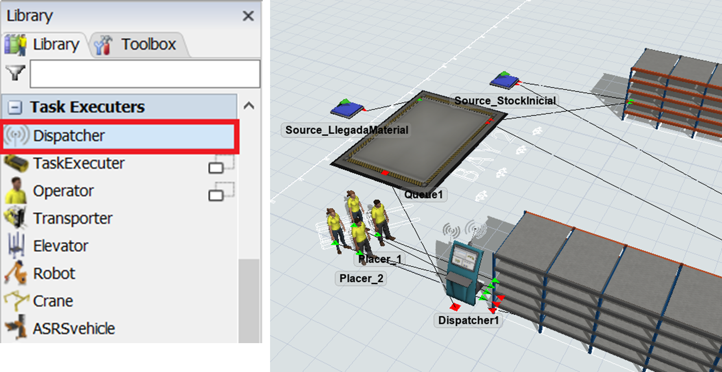 Para que estos operarios actúen como grupo y sea el propio FlexSim el que gestione de forma automática su selección, utilizaremos el objeto Dispatcher del menú Library en el apartado de Task Executers.