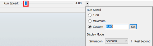 Para no tener que esperar tanto, la velocidad del modelo se puede acelerar en el menú superior de FlexSim (Run Speed); podemos desplazar la barra azul hacia la derecha, abrir el desplegable y manipular la velocidad desde su ventana.