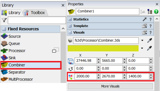 Habiendo finalizado la parte de las entradas a los Racks, pasamos a crear las salidas, al otro lado de éstos. En primer lugar, añadimos un objeto Combiner (Library → Fixed Resources) al espacio 3D de nuestro modelo y lo dimensionamos adecuadamente en Properties → Visuals (X=2000 mm, Y=2670 mm, Z=1400 mm).