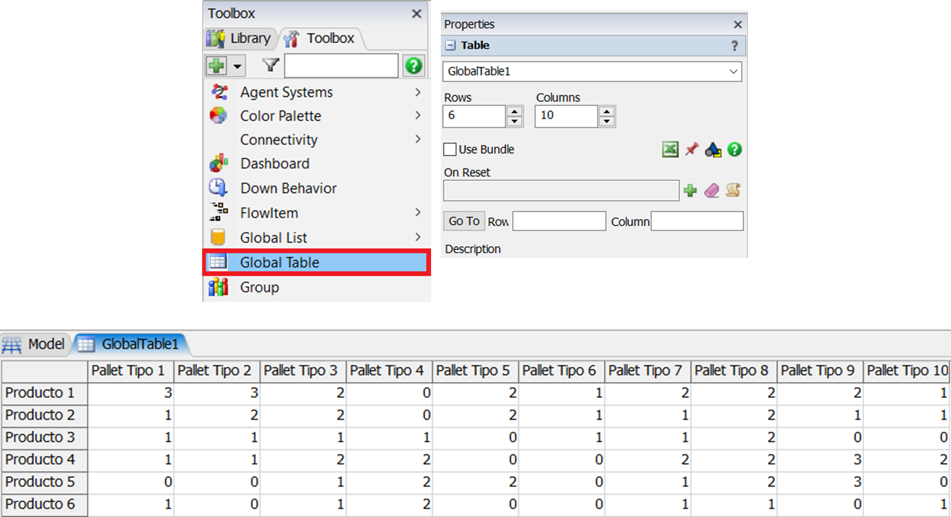 A continuación, creamos una tabla para indicar cómo se van a combinar estos 10 tipos de Pallets con los 6 tipos de productos disponibles en los Racks. Para hacerlo, accedemos al menú Toolbox y pulsamos el icono