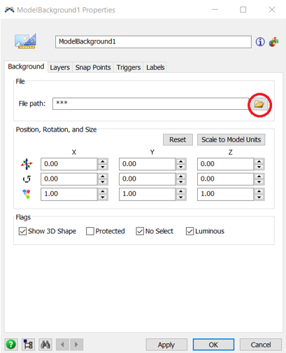 Dentro de la pestaña que se abre, buscamos y cargamos el archivo deseado pulsando sobre el icono de carpeta que se muestra junto al campo File Path, que abre el explorador de archivos de nuestro ordenador. Dentro de éste accedemos a la carpeta que contenga el archivo descargado, pulsamos sobre el archivo y seleccionamos Abrir. Dentro de esta ventana es posible ajustar dimensiones, rotación y posición del plano si fuese necesario.