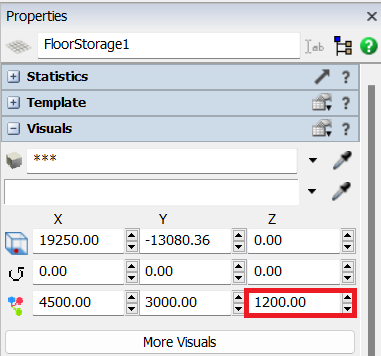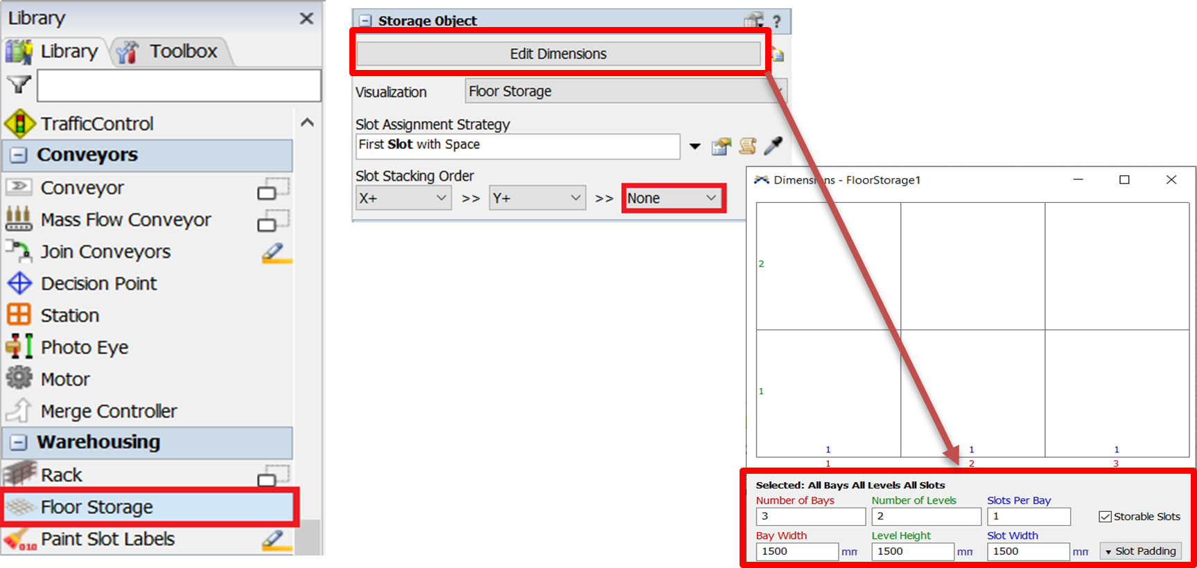 En último lugar, añadimos un objeto tipo Floor Storage (en Library, Warehousing) y lo redimensionamos tal y como aparece en la siguiente imagen. Además, en el menú Properties, apartado Storage Object, le pediremos que no ordene los objetos en Z (cambiar desplegable de “Z+” a “None”).