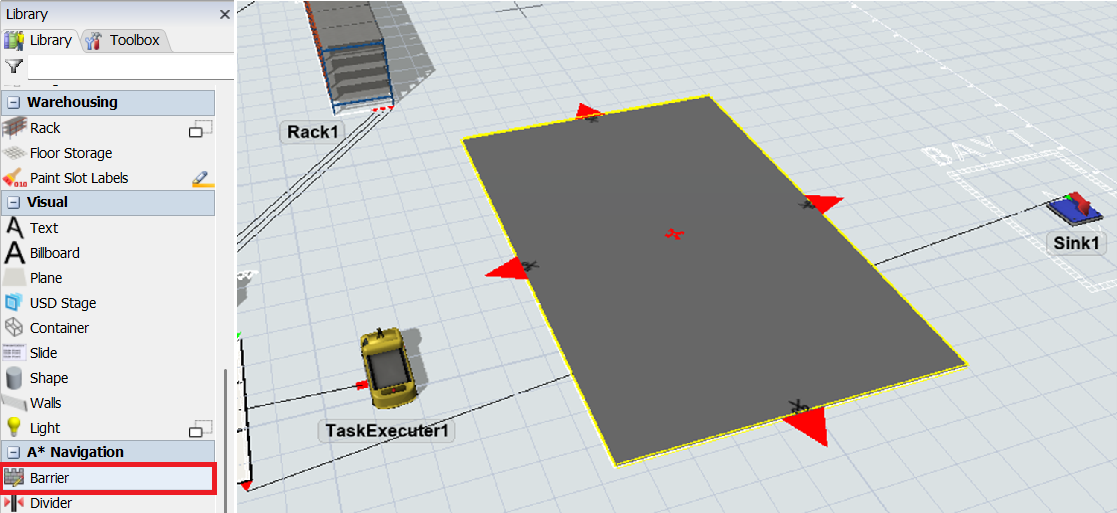 En el CAD se puede observar que hay una cuadrícula rectangular donde no hemos colocado ningún objeto 3D. En este espacio, la planta real contiene una sección que no es de interés para el modelo de estudio. Sin embargo, queremos que el TaskExecuter no viaje a través de la zona, así que tenemos que indicárselo. Para hacerlo, extendemos un objeto tipo Barrier (en Library → A* Navigation) en la zona que no queremos que sea de paso (es decir, a lo largo y ancho de la cuadrícula).