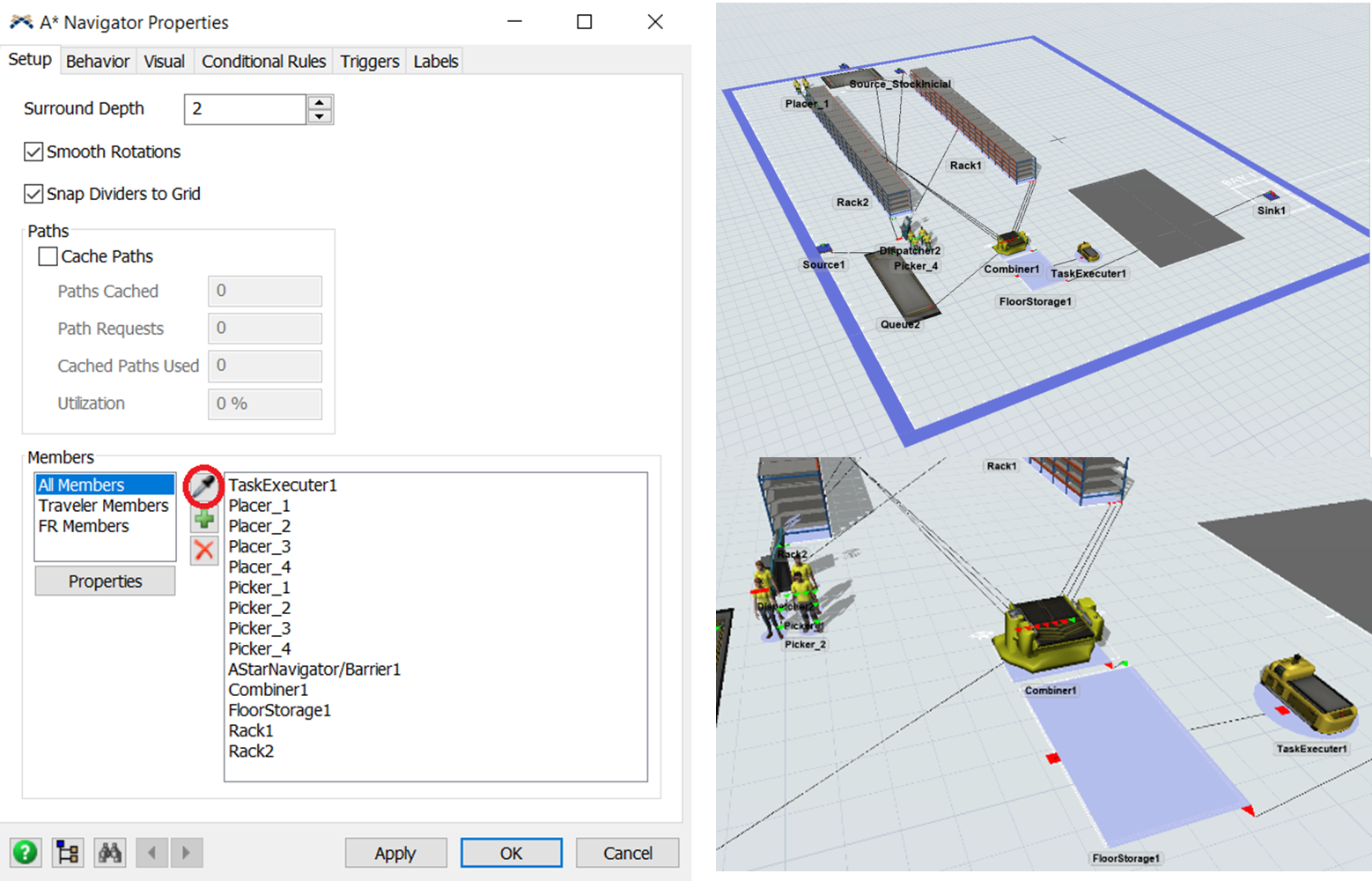 Una vez creados y colocados los objetos anteriores, tenemos que configurar el navegador. Haremos doble-clic sobre el objeto A* Navigator que ha aparecido en ToolBox y, en la ventana emergente, cogeremos el Sampler (el icono del cuentagotas) y pulsaremos sobre el TaskExecuter, el Combiner, el Floor Storage, todos los Operators y los dos Racks, uno a uno. De esta manera nos aseguramos de que todos los objetos que tienen que viajar en el modelo lo hagan “esquivando” los demás objetos de la planta. Se puede comprobar que los objetos se han añadido bien al navegador si les aparece un círculo azul debajo de su forma 3D.
