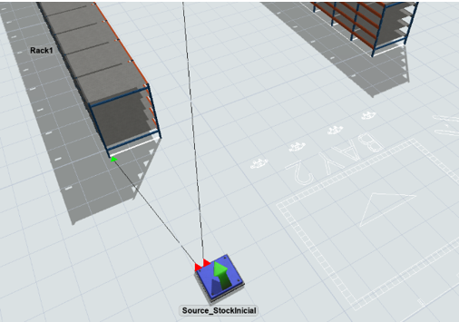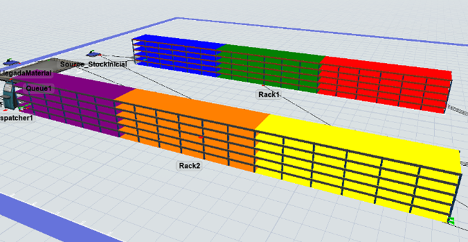 Esta fuente la podemos renombrar como “Source_LlegadaMaterial”, por ejemplo. También debemos hacer una conexión de tipo entrada-salida entre la Queue y el Rack1 y entre la Queue y el Rack2.