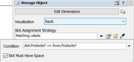 Con estos Slots asociados a cada tipo de producto, cambiamos la estrategia de almacenaje de los Racks en Properties → Storage Object → Slot Assignment Strategy → Matching Labels con la siguiente condición: