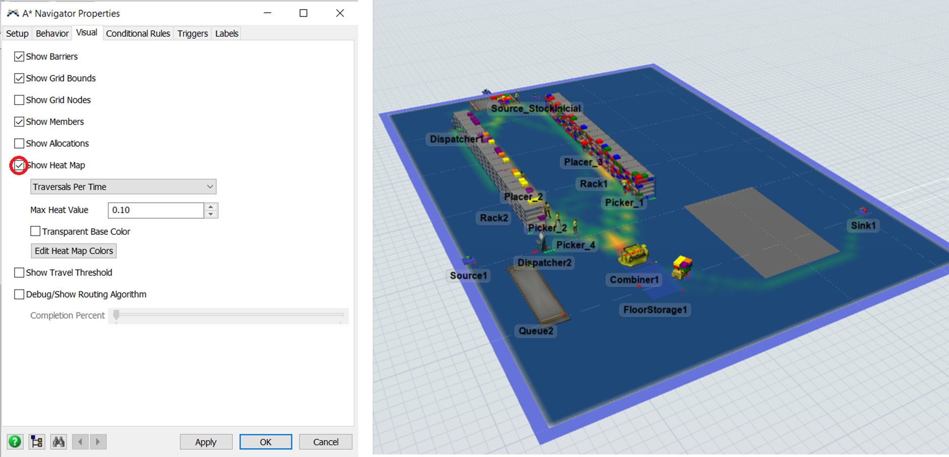 En primer lugar, podemos activar la opción Show Heat Map (doble-clic en el objeto A* Navigator, apartado Visual) que dibuja en colores los caminos que por los que se están desplazando los diferentes objetos cuando se ejecuta el modelo. De esta forma, podemos observar si los miembros del navegador viajan evitando los diferentes obstáculos establecidos.