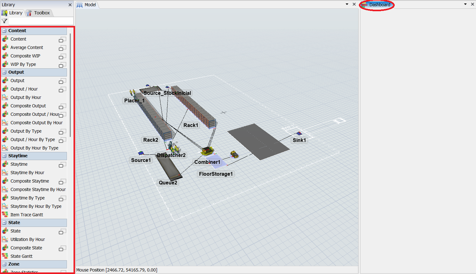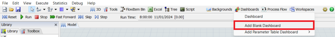 Para visualizar y acceder a la Liberia de métricas abriremos un nuevo Dashboard del menú superior de FlexSim (Dashboards → Add Blank Dashboard).