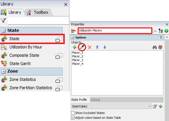 Una vez creado, pulsamos sobre el gráfico en blanco y accedemos a su menú Properties (a la derecha). Con el Sampler (en Options → Objects) seleccionamos los Placers en el modelo y cambiamos el nombre del gráfico a, por ejemplo, “Utilización Placers”.