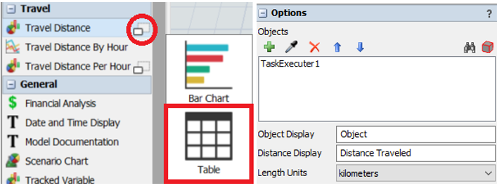 A continuación, queremos visualizar la distancia total que viaja el TaskExecuter. Para obtener este valor, arrastramos una Table de tipo Travel Distance (Library → Travel Distance) y la vinculamos a este objeto. Para obtener unos resultados más útiles de esta tabla, podemos cambiar las Length Units a meters o kilometers.