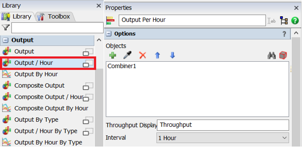Además de las estadísticas anteriores, nos interesa observar el valor del Throughput por hora del Combiner, que podría ser uno de los parámetros más críticos de la planta. Para representarlo, arrastramos un gráfico Output/Hour de Library → Output y lo relacionamos con este Combiner.