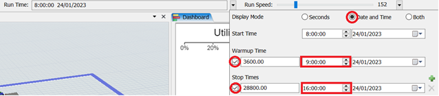 Para poder evaluar los resultados, estableceremos un tiempo de ejecución del modelo. En el desplegable del menú superior que se encuentra junto a Run Time seleccionamos Date and Time, marcamos las casillas Stop Time y Warmup Time y les ponemos el valor deseado (por ejemplo, que termine a las 16:00 y que haga un Warmup a las 9:00).