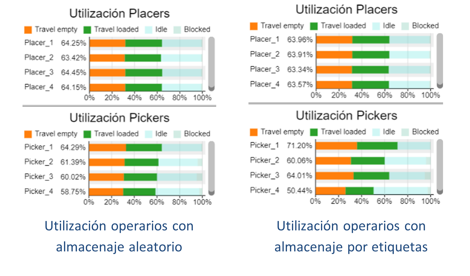 Si cambiamos el método de almacenaje a aquél que ordena las cajas según los productos asociados a cada hueco del Rack (establecidos con Paint Slot Label), las utilizaciones de los operarios cambian de la siguiente forma: