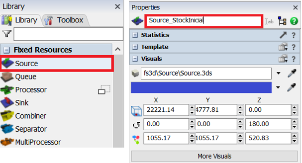 Para poder seguir mejor el tutorial y tener más ordenado el modelo, cambiaremos el nombre a los diferentes objetos 3D que se van añadiendo a uno que represente su función. En este caso, cambiaremos el nombre de esta Source a “Source_StockInicial”. Para hacerlo, simplemente introducimos el nombre deseado en el menú Properties del objeto, que se abre pulsando una vez sobre él.